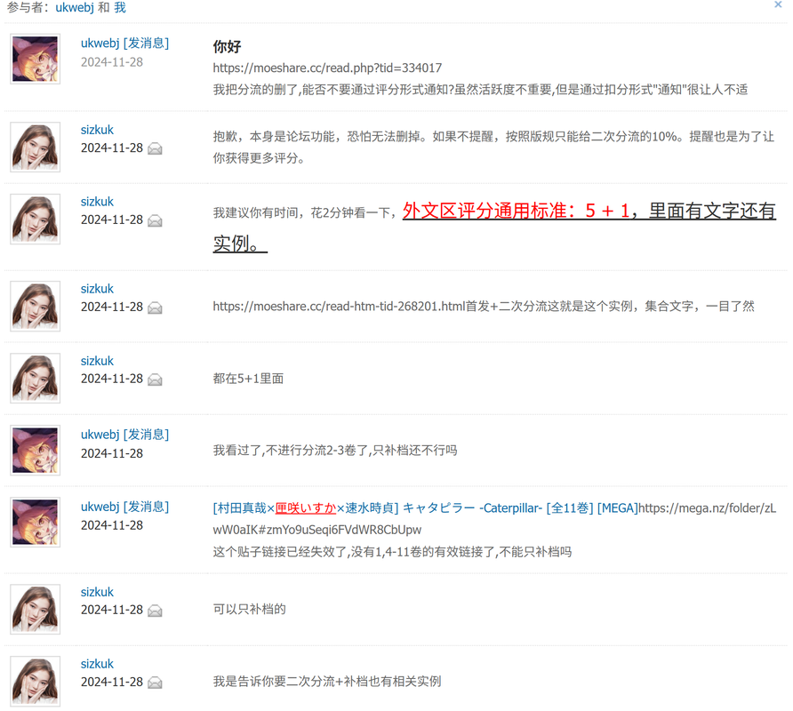 资源属性:请在贴中注明资源属性为首发/补档或二次分流,还是两者都有,若是两者都有请分开附上单卷信息(示例),否则按照最低评分标准(二次分流的10%)。